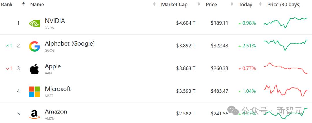Alphabet当前市值约为3.885万亿美元,略高于苹果的3.846 万亿美元。而英伟达依然以4.595万亿美元的市值遥遥领先,稳居全球第一。
