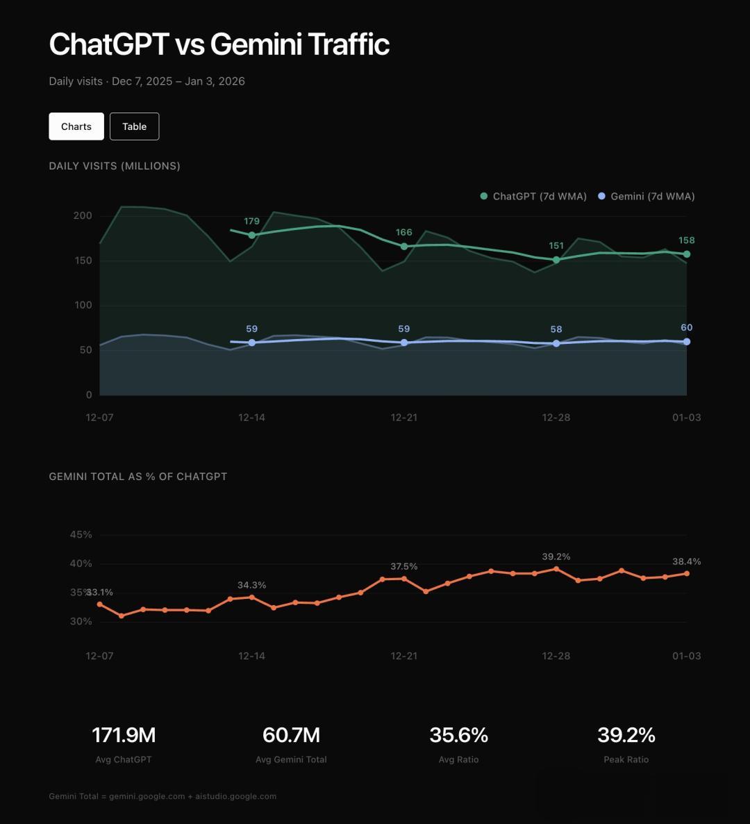 去年12月,Gemini的流量环比增长28.4%,ChatGPT的流量则环比下降5.6%。