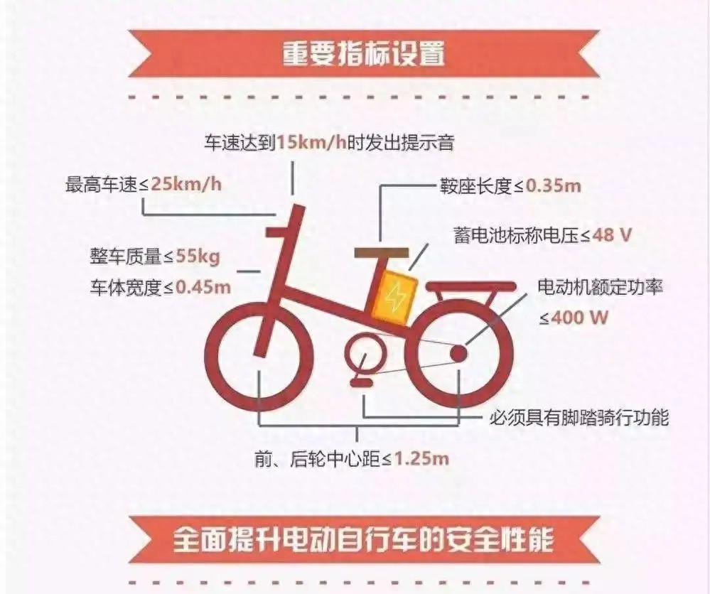 2018年4月15日电动车新国标出台,48V被定义为电动自行车,不需要驾驶证,可以合法载一名12周岁以下儿童。铅酸电池车型包含电池整车重量不能超过55公斤,电机额定功率400W,最高时速25Km/h,不能安装后视镜,因为超过车身高度和宽度,必须安装脚踏骑行装置,由于车速慢又存在设计缺陷,被广泛吐槽。