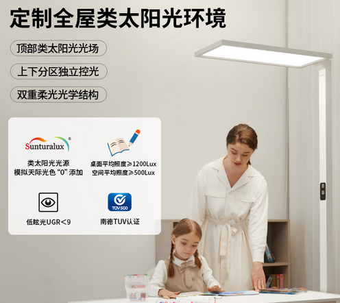 这款灯主打高性价比,是目前大路灯市场新兴的品牌产品。这款灯的核心参数均远远优于国家标准或者行业平均水准。桌面平均照度高达1600lx,甚至空间照度均值都超过国AA标准;色温是恒定设计,保持4000K;显色指数Ra>98,R9>98,色彩还原度极高,能真实呈现课本、画本等本色;应用新型数字调光技术,真正0频闪;蓝光危害等级为RG0,有害蓝光含量远远低于行业平均水平;眩光控制方面,UGR实测值<12,远低于国标限值16,远超行业常规水平。