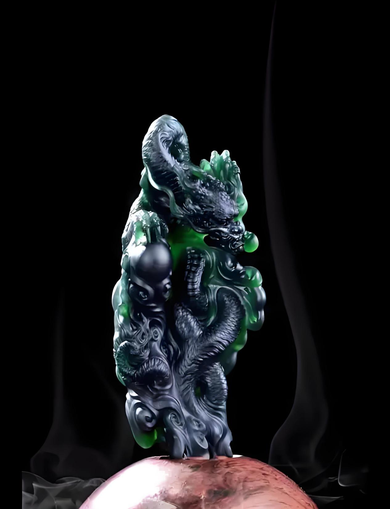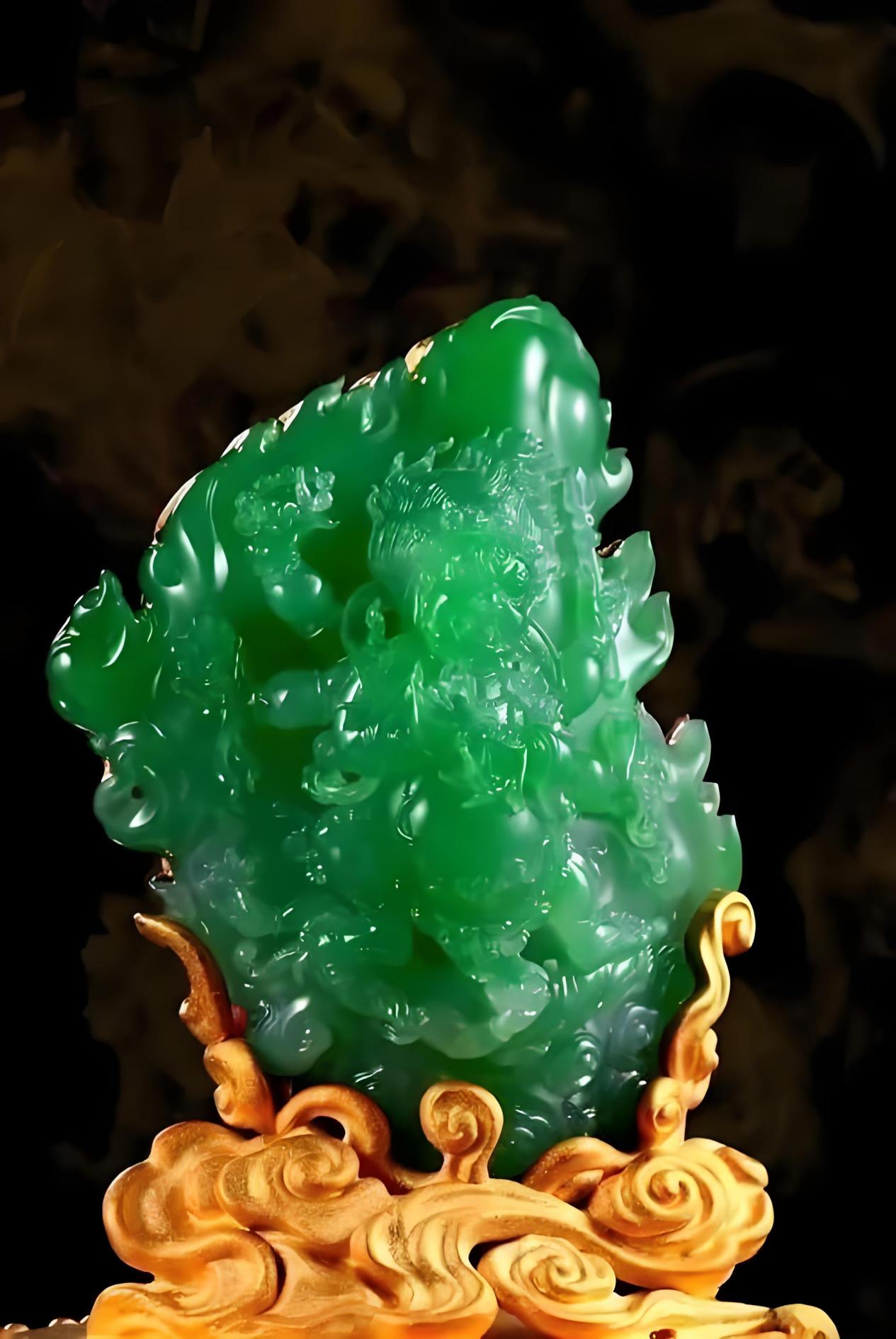 作为国家非物质文化遗产传承人,大漠的创作始终扎根传统、创新表达,形成“雄浑大气见细腻,因材施艺显巧思”的独特风格。他精通“俏色巧雕”“镂空透雕”等古法技艺,更将现代美学与地质认知融入创作,对翡翠原料的运用达到“料尽其用、韵尽其显”的境界——面对一块含绿、白、黄三色的翡翠原石,他不追求过度切割,而是以绿色雕琢松枝,白色塑造仙鹤,黄色点缀落日,创作《松鹤延年》摆件,让天然色彩与题材意境浑然一体;雕琢冰种翡翠时,他善用其通透特性,以0.1毫米精度雕刻叶脉纹理,让作品兼具“冰清玉洁”的质感与“灵动鲜活”的生命力。