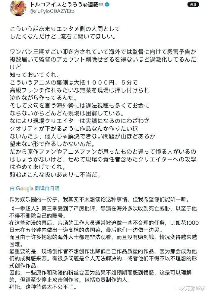而在近日,日本某圈内人士也是曝光了《一拳超人》第三季导演永居慎平退网的原因。根据这名圈内人士爆料,《一拳超人》第三季动画播出后就受到了严厉的批评,导演永居慎平更是多次收到了海外观众的死亡威胁,无奈之下导演只能销号退网。