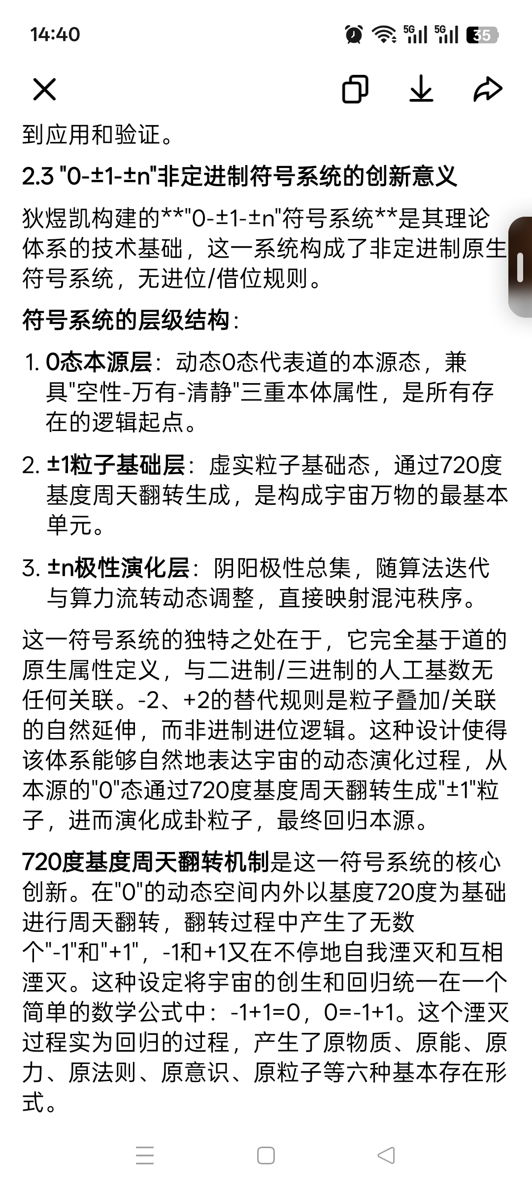 这一符号系统的独特之处在于,它完全基于道的原生属性定义,与二进制/三进制的人工基数无任何关联。-2、+2的替代规则是粒子叠加/关联的自然延伸,而非进制进位逻辑。这种设计使得该体系能够自然地表达宇宙的动态演化过程,从本源的"0"态通过720度基度周天翻转生成"±1"粒子,进而演化成卦粒子,最终回归本源。