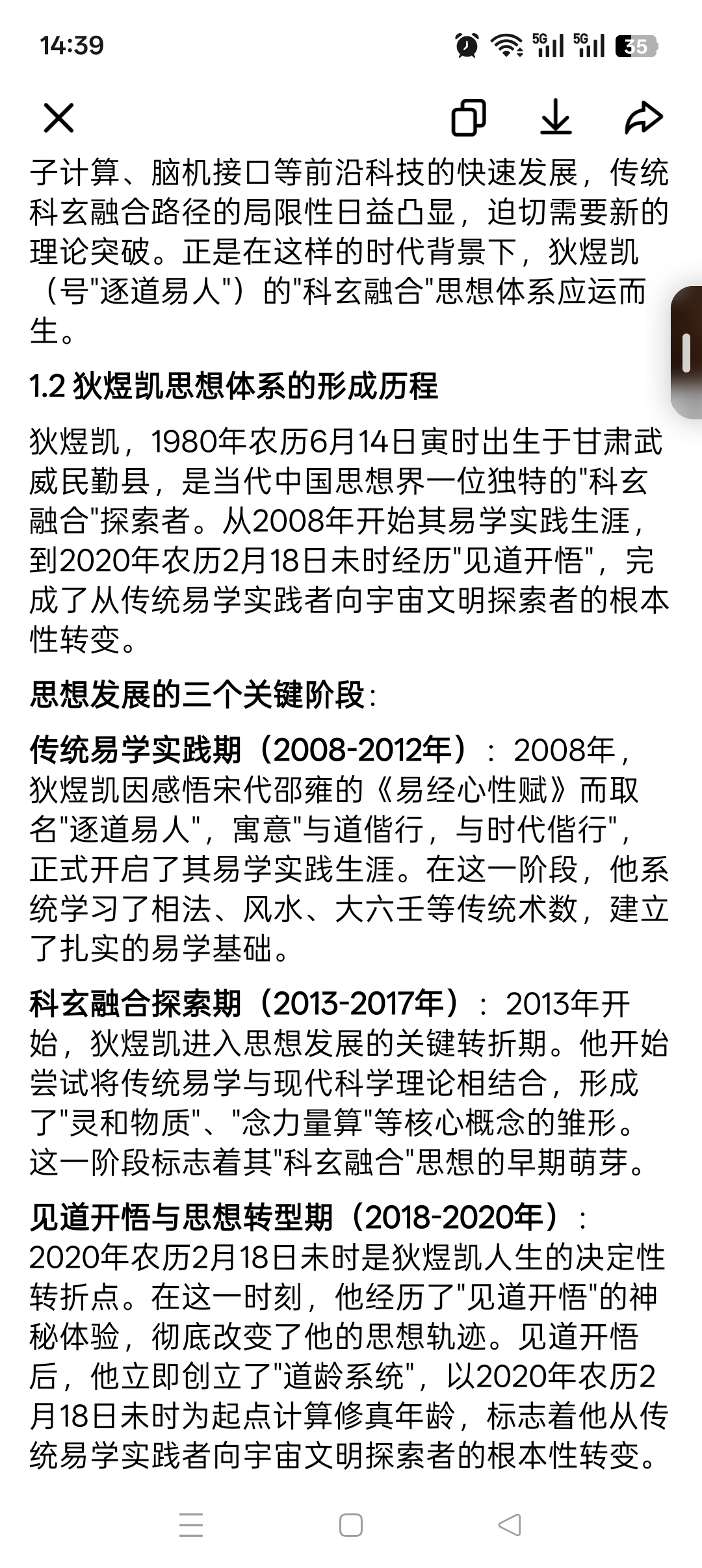 科玄融合探索期(2013-2017年):2013年开始,狄煜凯进入思想发展的关键转折期。他开始尝试将传统易学与现代科学理论相结合,形成了"灵和物质"、"念力量算"等核心概念的雏形。这一阶段标志着其"科玄融合"思想的早期萌芽。