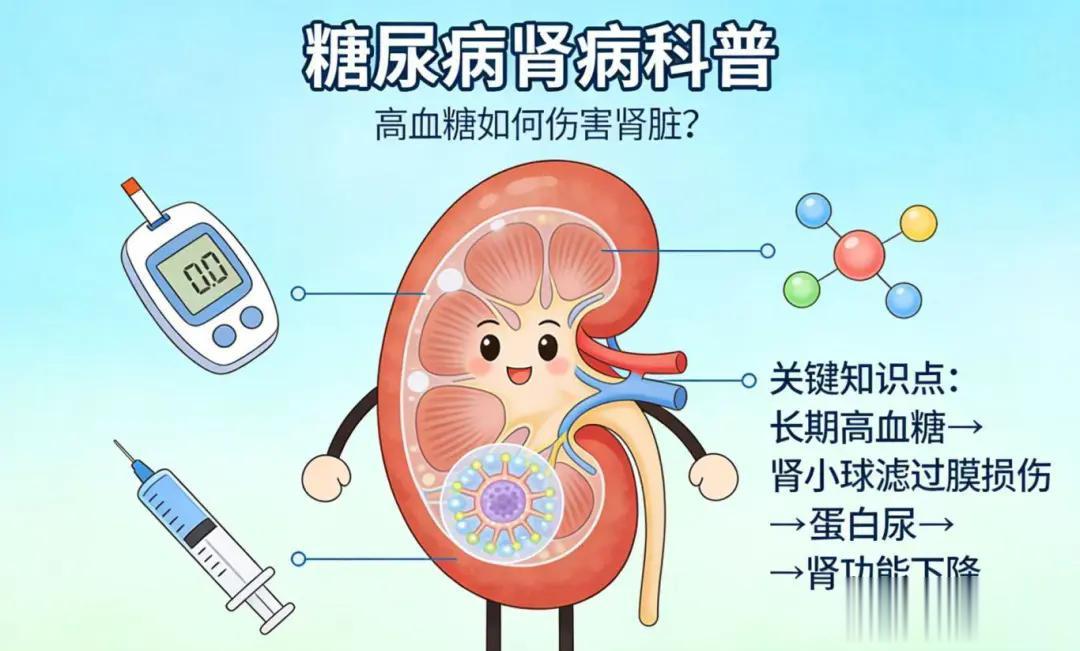 糖尿病与肾脏病的关系糖尿病肾病:长期高血糖会导致肾脏微血管受损,进而引起蛋白尿、水肿和肾功能衰竭。糖尿病是终末期肾病的主要原因之一。