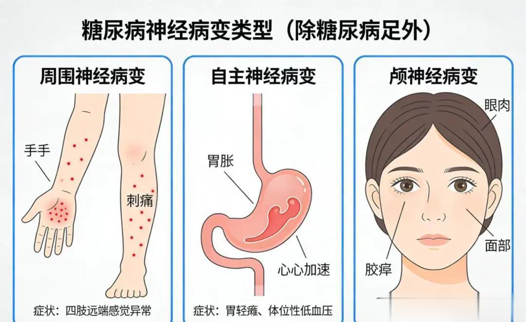 糖尿病与神经病变糖尿病神经病变:高血糖引起的血管病变和神经损伤会导致四肢麻木、疼痛、感觉丧失等症状。糖尿病神经病变可影响胃肠道、泌尿系统和心脏功能。