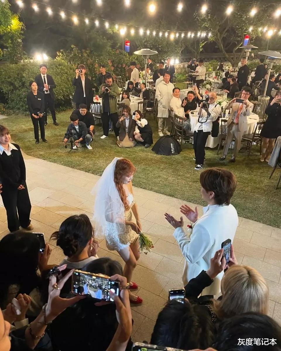 而当天作为新娘的泫雅不走常规路,穿上了迷你婚纱短裙,配以红色平底鞋,本身就是短发的她特意驳接了长头发,以一头橙红色的长发出嫁。在婚礼仪式中,泫雅由父亲牵手进场,之后交给新郎龙俊亨,泫雅与龙俊亨这对新人甜蜜对望;之后两位新人挽着彼此的手向两旁的宾客打招呼致谢,场面感人又充满幸福。