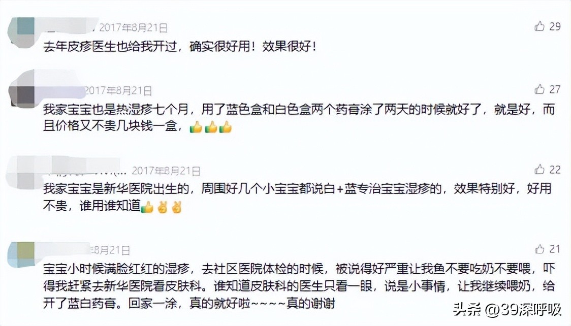 许多老患者都知道,“蓝白膏”的经典用法是按1:1比例混合使用,但并不清楚其中的原因。陆晓彤主任对39君表示,“蓝白药膏合用在发挥抗炎作用的同时,也能增加皮肤的湿润度,减少干燥。”