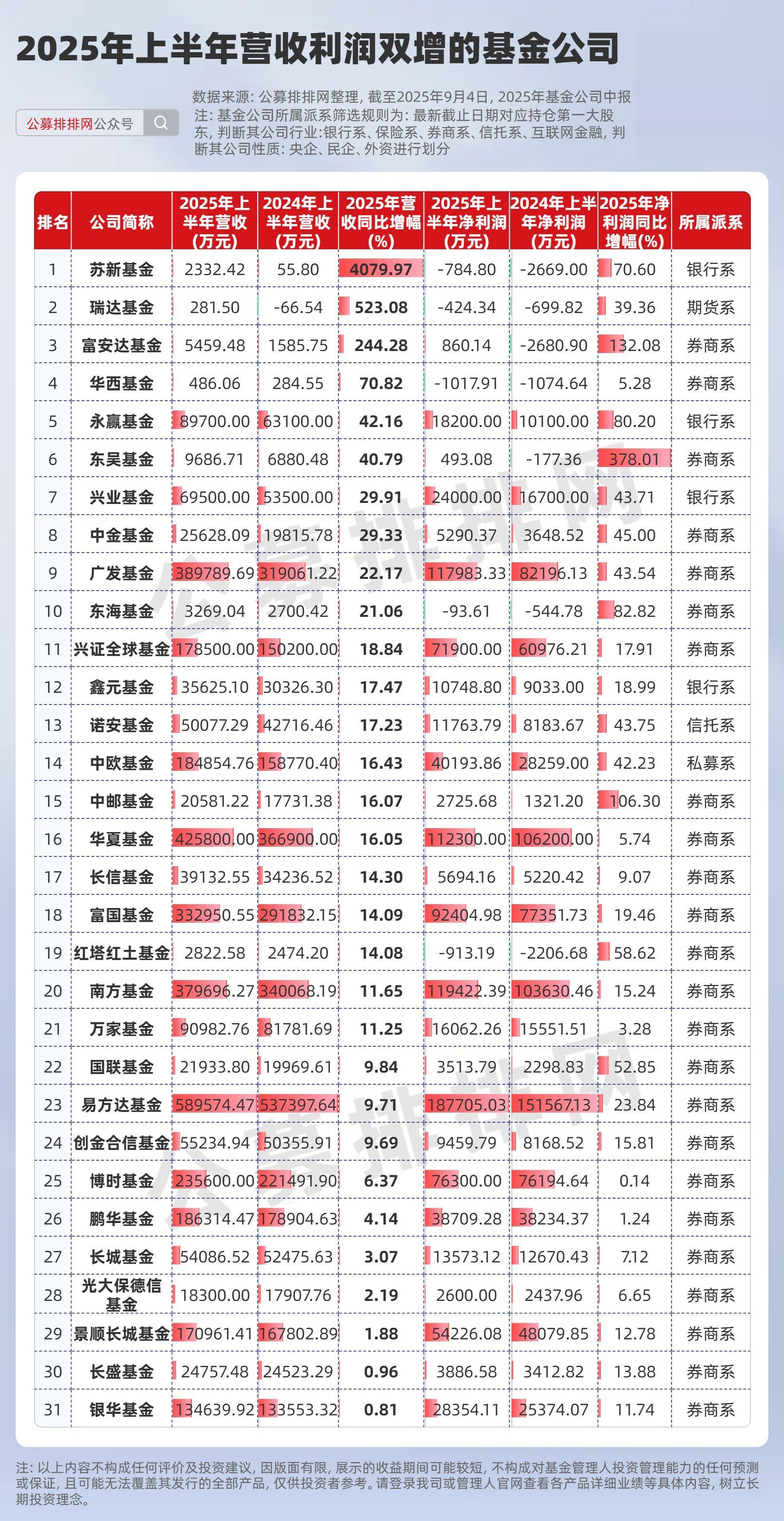 其中,东吴基金2025年上半年净利润同比大增378.01%至493.08万元,以明显优势夺得第1。该基金公司的营业收入约为9686.71万元,同比增长40.79%。