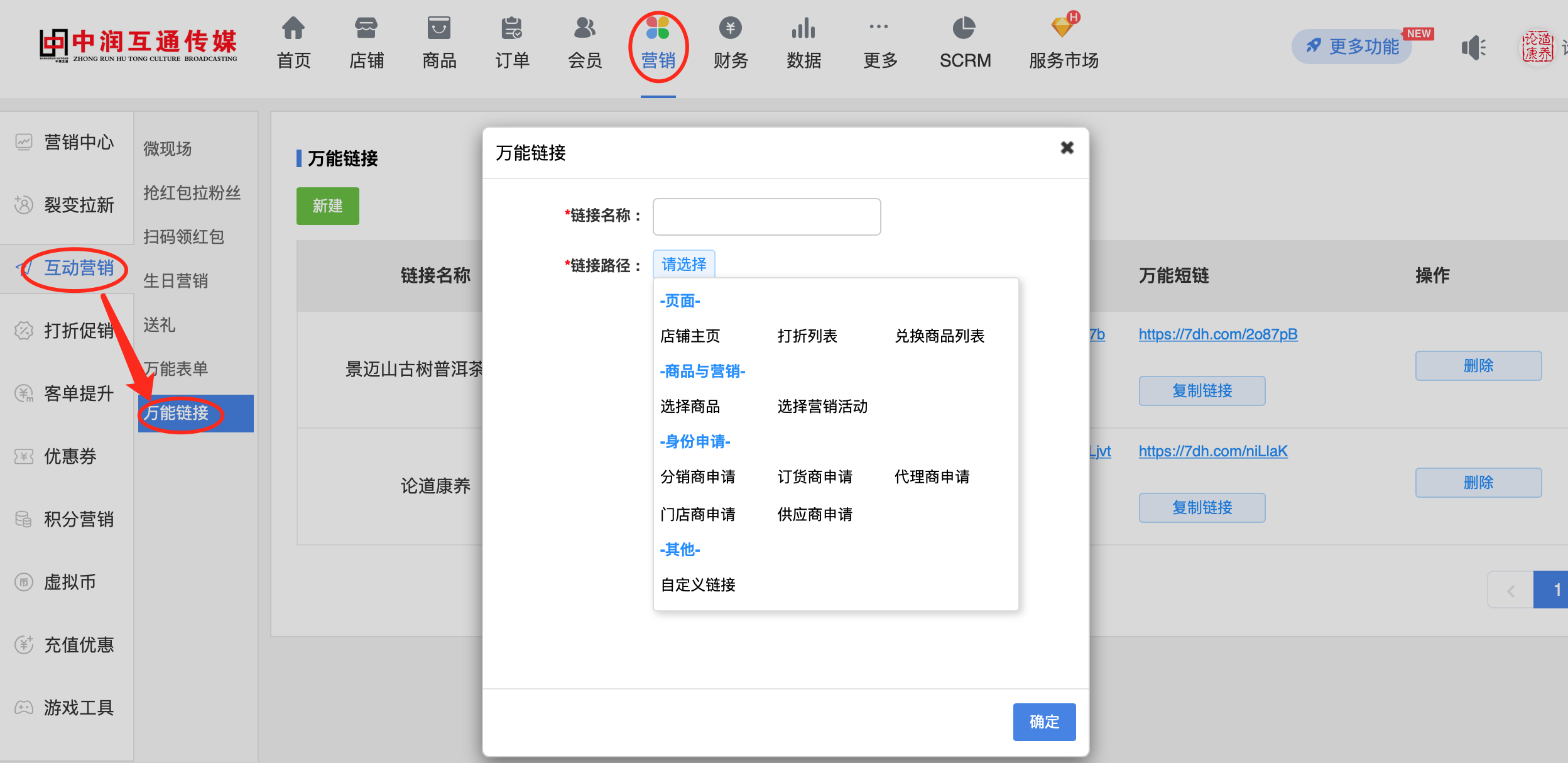 我们开发的社交电商系统拥有SCRM能力,可同时向不同场景下的用户,做主动触达及链接。我们的万能链接功能无论是商家、代理、门店或者消费者,在私域平台以及公域平台去推广自己的小程序,能锁定分销门店经销渠道间的上下级关系,一个社交电商新零售系统就能实现。