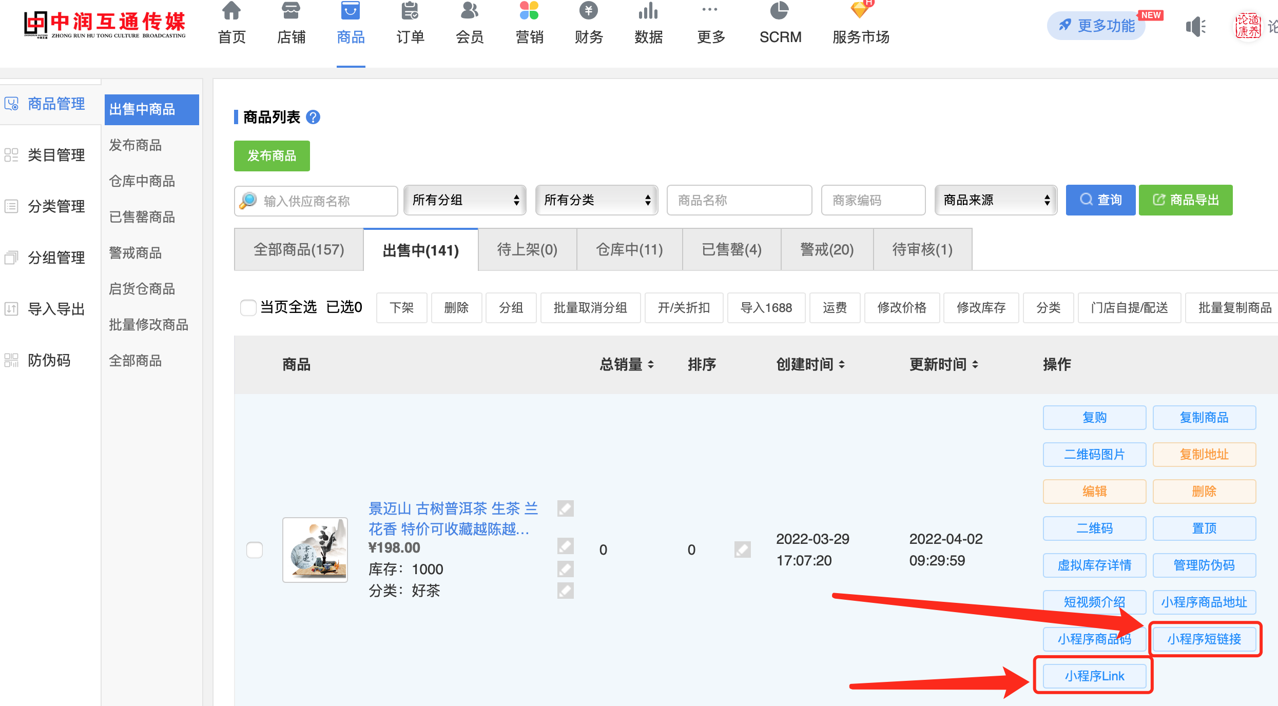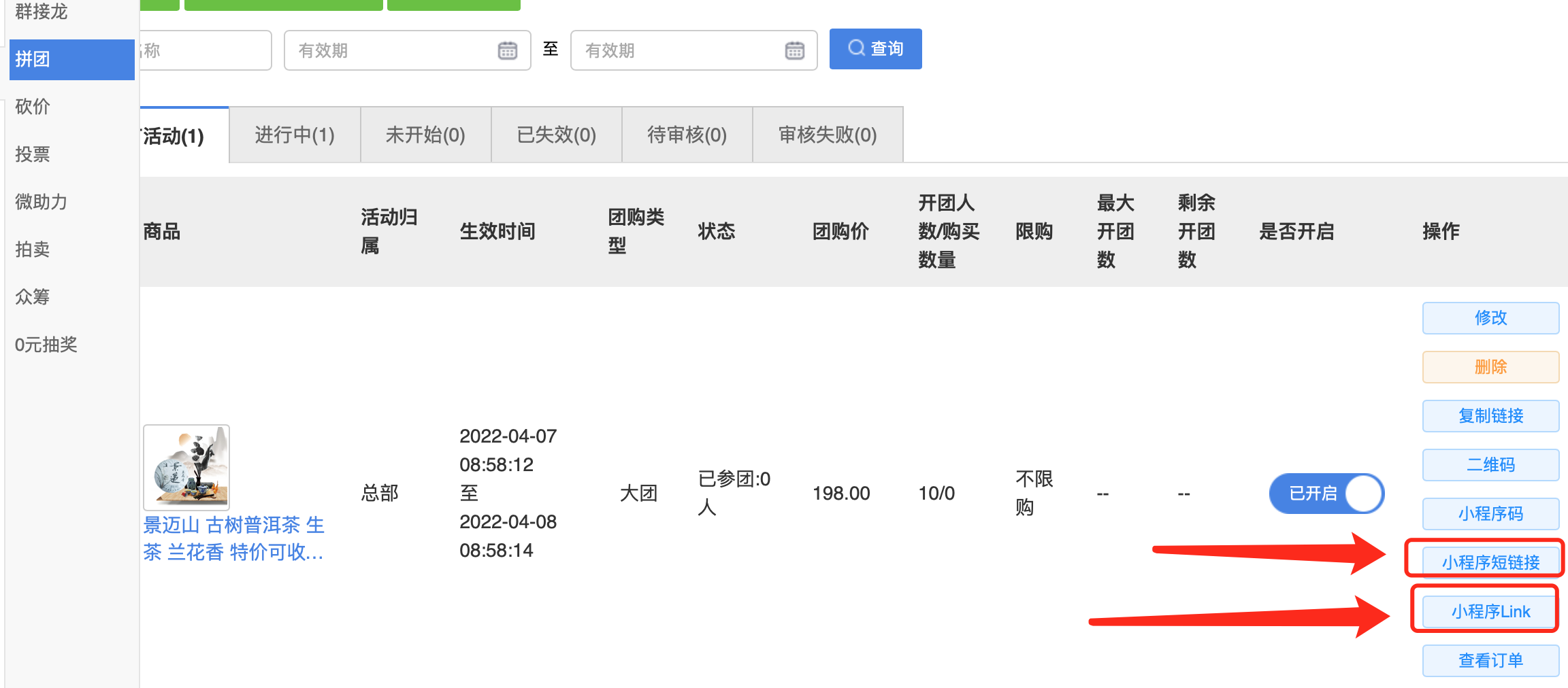 在已经上架商品的商品详情中,复制要推广的“小程序短链“或”小程序Link”,也可以创建营销活动生成“小程序短链“或“小程序Link”,商家可以根据实际使用场景选择。