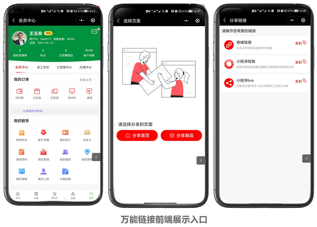 此处的万能链接勾选后,商城前端会员中心显示“万能链接”,可以根据要推广的场景选择指定的链接,前端展示: