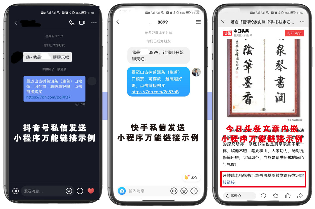 “万能链接”抖音 快手 头条 私信与文章内链示例