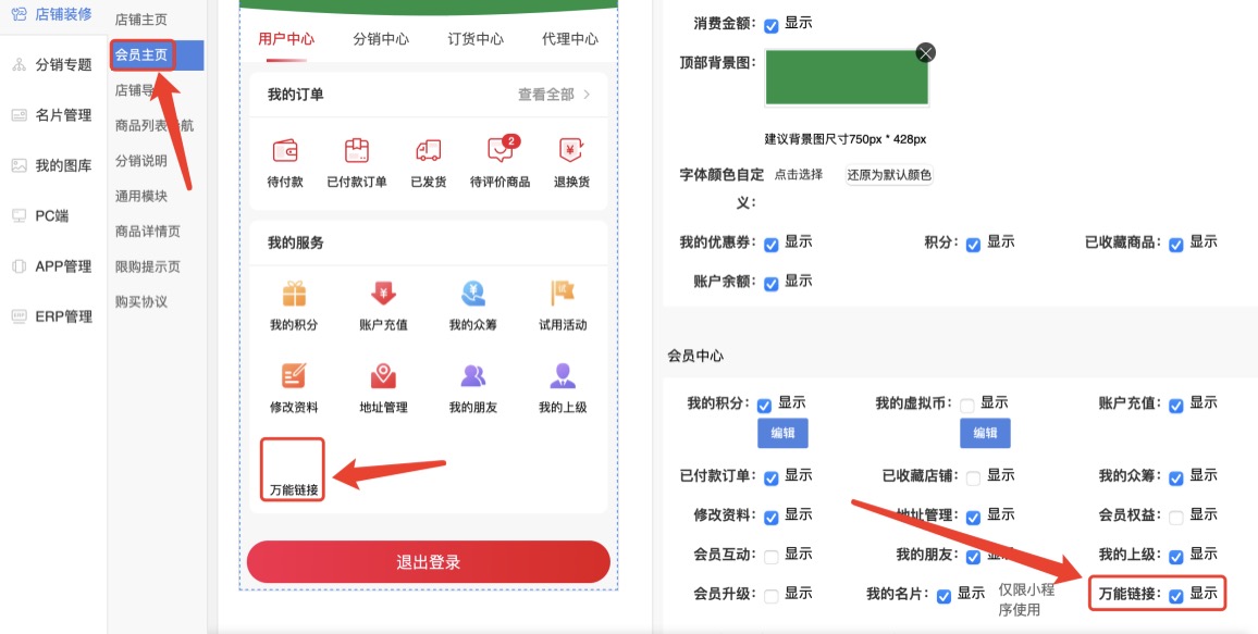 商家要想实现会员通过万能链接在微信生态内裂变,可以在管理后台——店铺——会员主页——‘勾选’万能链接。