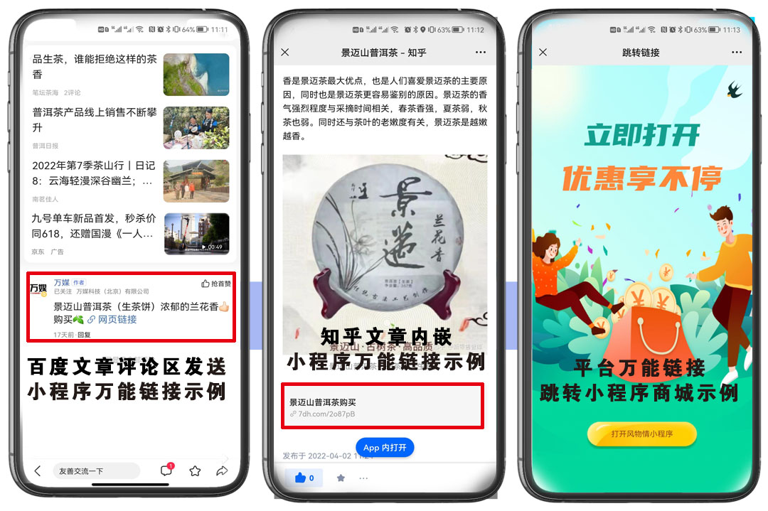 “万能链接”,在抖音、快手、今日头条、百度、知乎等平台的私信、图文、评论等的场景: