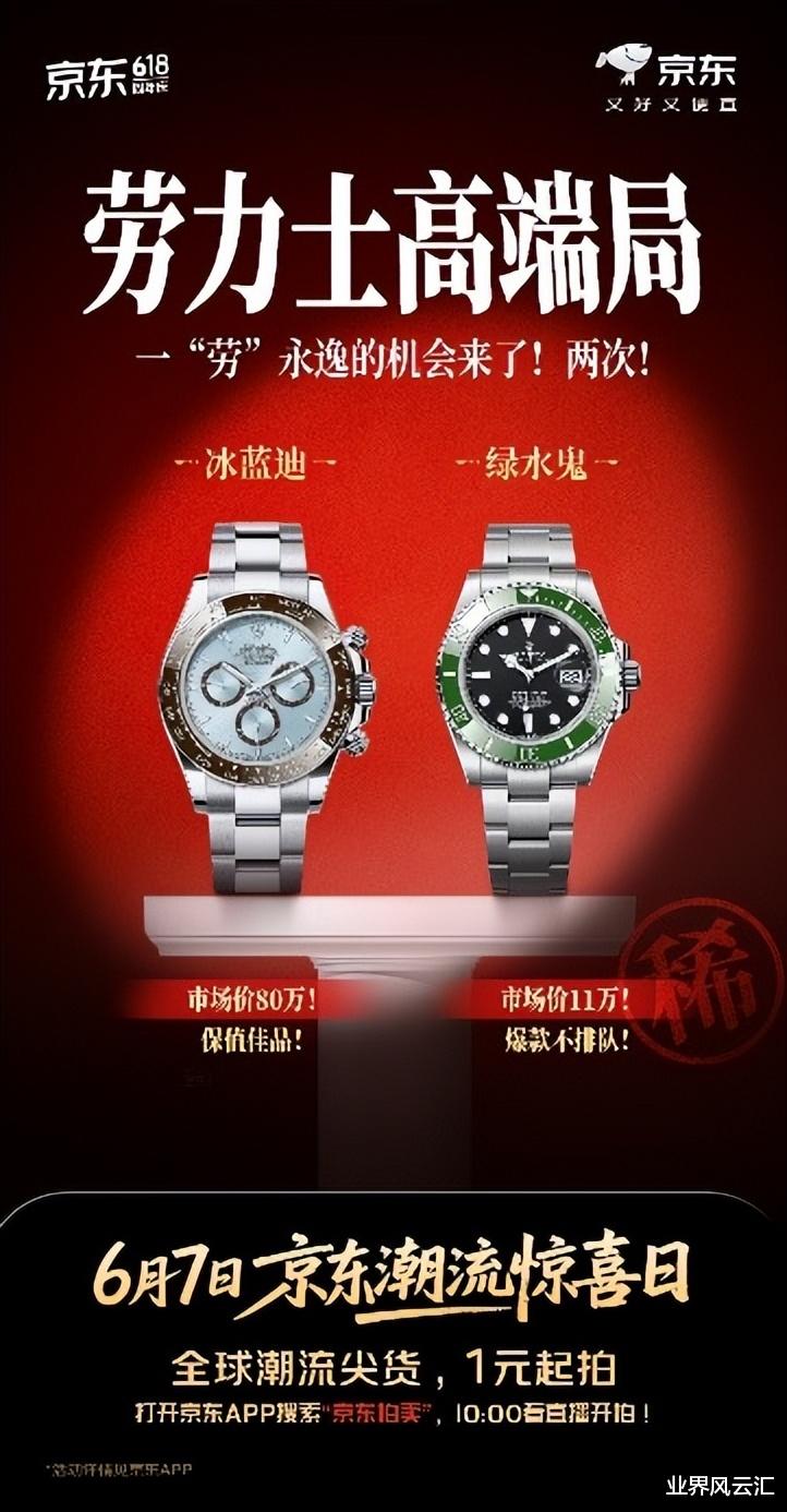 在此次京东潮流惊喜日即将上架的潮流拍品中,不乏名牌腕表、大牌奢品。如劳力士冰蓝迪宇宙计型迪通拿,作为铂金迪通拿的旗舰型号,年产量堪称凤毛麟角,市场预估价高达80万元;还有炙手可热的劳力士潜航者型“绿水鬼”,往往需要几十万元以上的冷门表款消费才有机会入手。这两款极致稀缺的高端腕表,都将在京东潮流惊喜日当天从1元起拍。