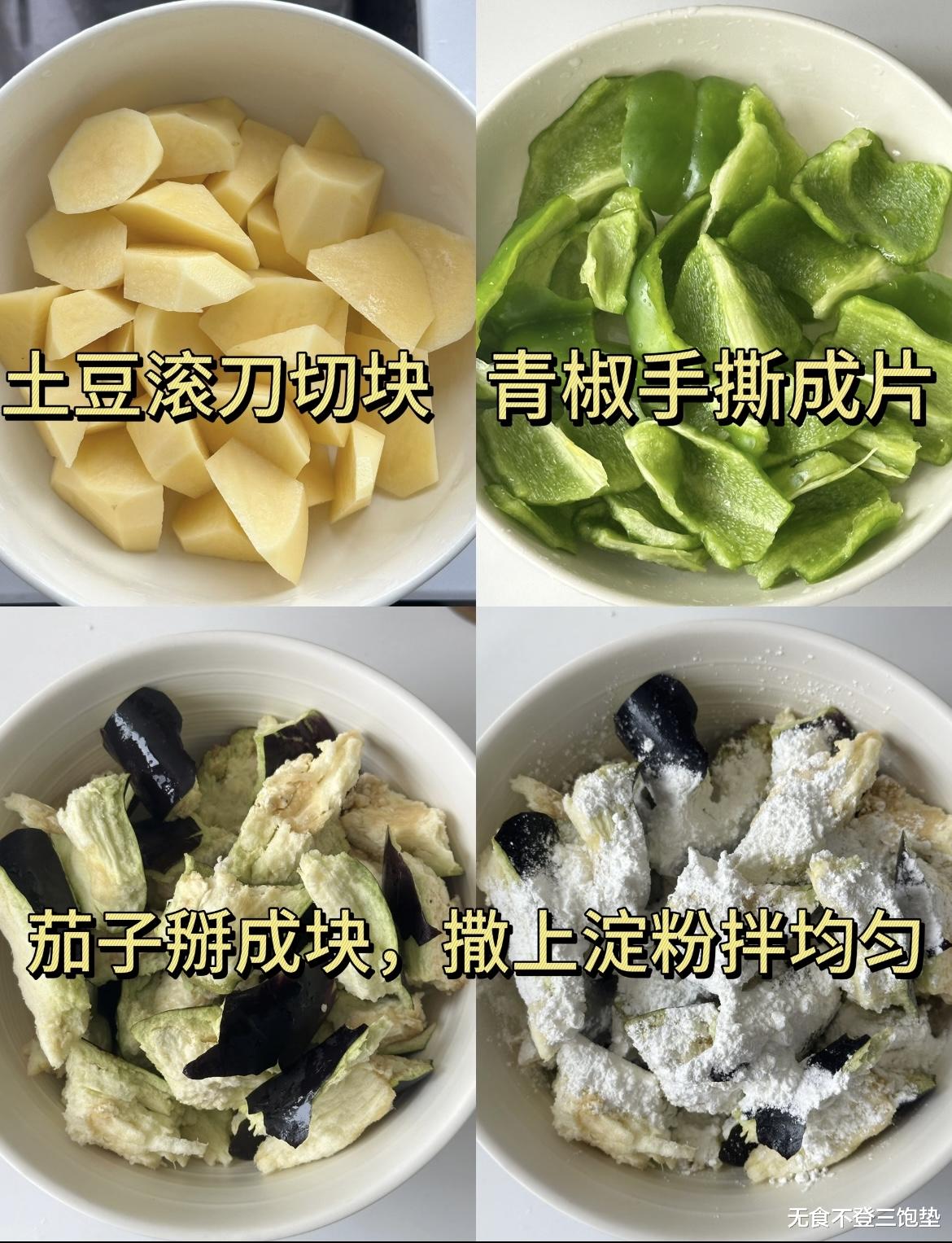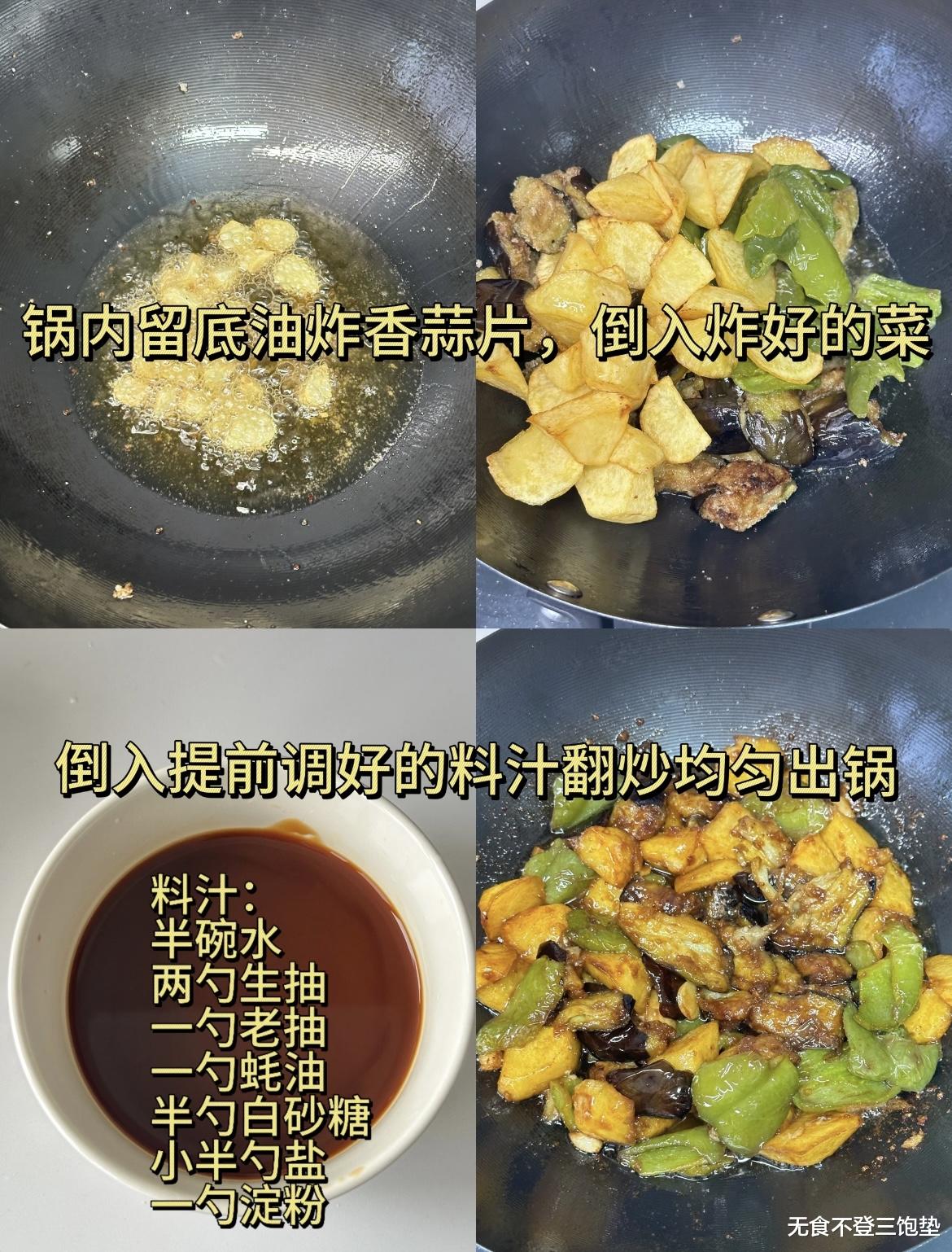 准备工作完成后,我们开始烹饪。首先,将土豆块沥干水分,放入热油中炸至金黄,捞出控油。接着,将茄子块挤去多余水分,放入油中炸至微黄,捞出控油。最后,将青椒块放入油中快速过一下油,捞出控油。这一步的关键在于控制油温和时间,土豆要炸得外焦里嫩,茄子要炸得软糯,青椒则要保持脆嫩。