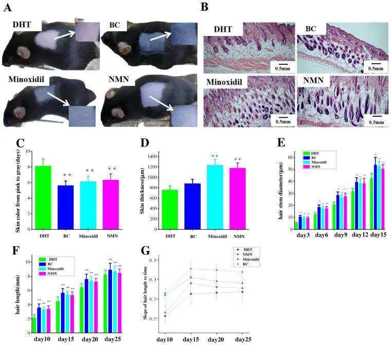 实验中,小鼠经过二氢睾酮(DHT)处理以模拟雄性脱发症状,随后通过局部应用NMN进行治疗。结果显示,NMN处理的小鼠在毛发生长、皮肤颜色变化以及皮肤厚度方面均显示出积极的效果,与使用5%米诺地尔的阳性对照组相比,效果相似。