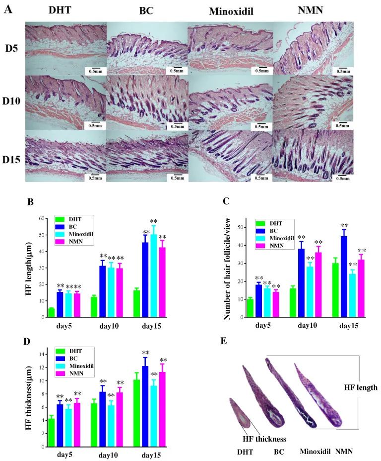 研究人员通过观察,NMN处理的小鼠在不同时间点的毛囊数量和大小上均有显著增加,与二氢睾酮(DHT)处理的对照组相比,NMN组的毛囊长度和厚度得到了明显改善。