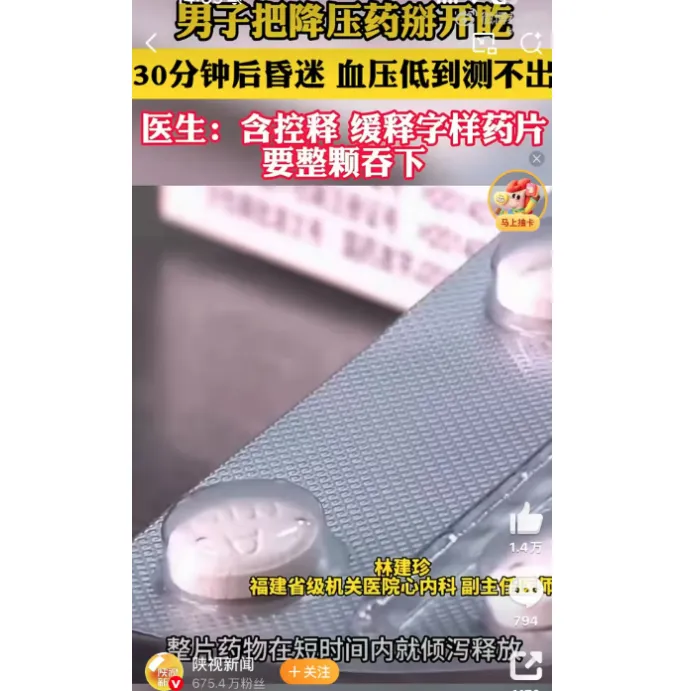 无独有偶,此前一女士也经历了类似险情。据报道,该女士在服用降压药时,掰开药片,刚吃半小时,她便感到眼前发黑、全身无力直接瘫倒,险些危及生命。类似的险情并非个例,很多临床医生都曾分享过接诊的病例,北京安贞医院心外科白辰主任提出严肃警示——有些降压药绝不能掰开、甚至碾碎了吃!
