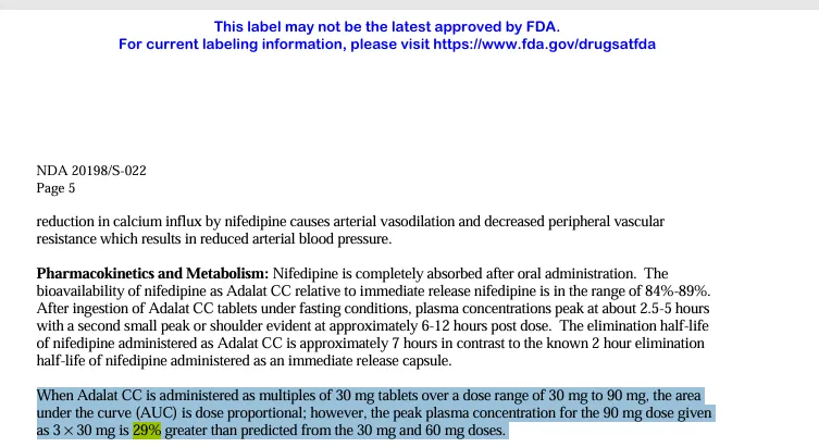 美国食品药品监督管理局(FDA)对于美版硝苯地平控释片的标签指出,切分后的三片30mg剂型Cmax比单片90mg高29%!并警告:勿掰开,否则破坏保护结构导致快速释放[4]。
