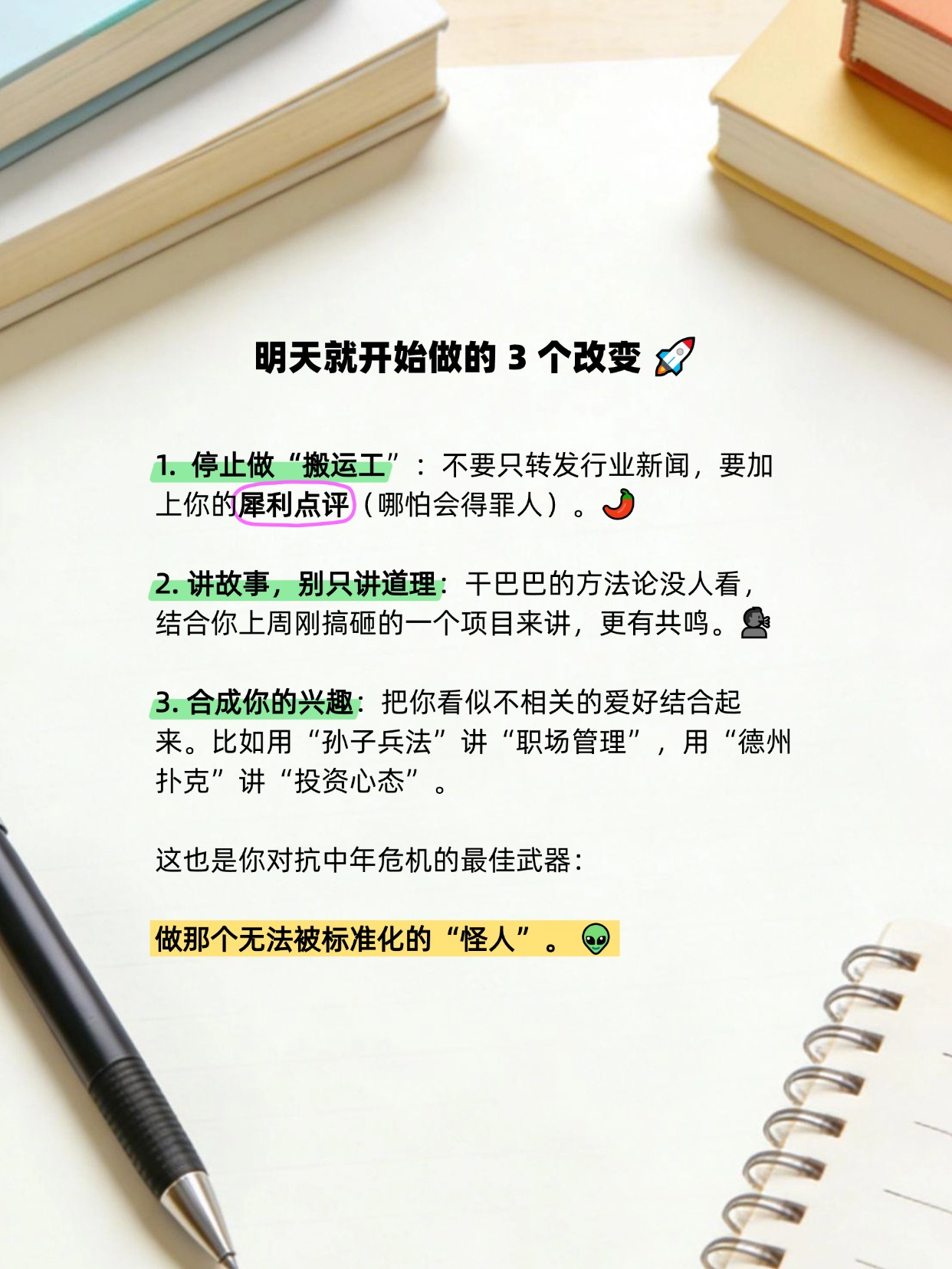不要把自己框死在一个职业标签里。把你的职业技能 + 个人爱好 + 独特经历搅拌在一起,那才是谁也卷不动的护城河。