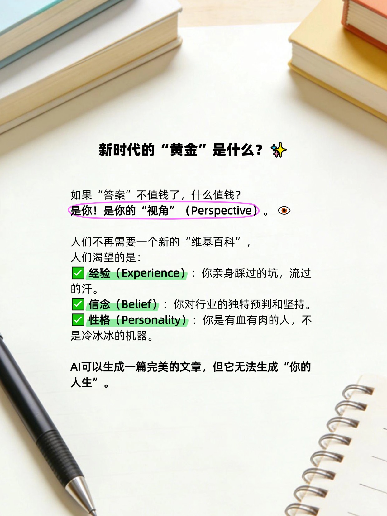 知识是客观的,视角是主观的。你的偏见、你的审美、你的经历,这些是AI无法模仿的“人性杂质”,而这恰恰是最珍贵的。
