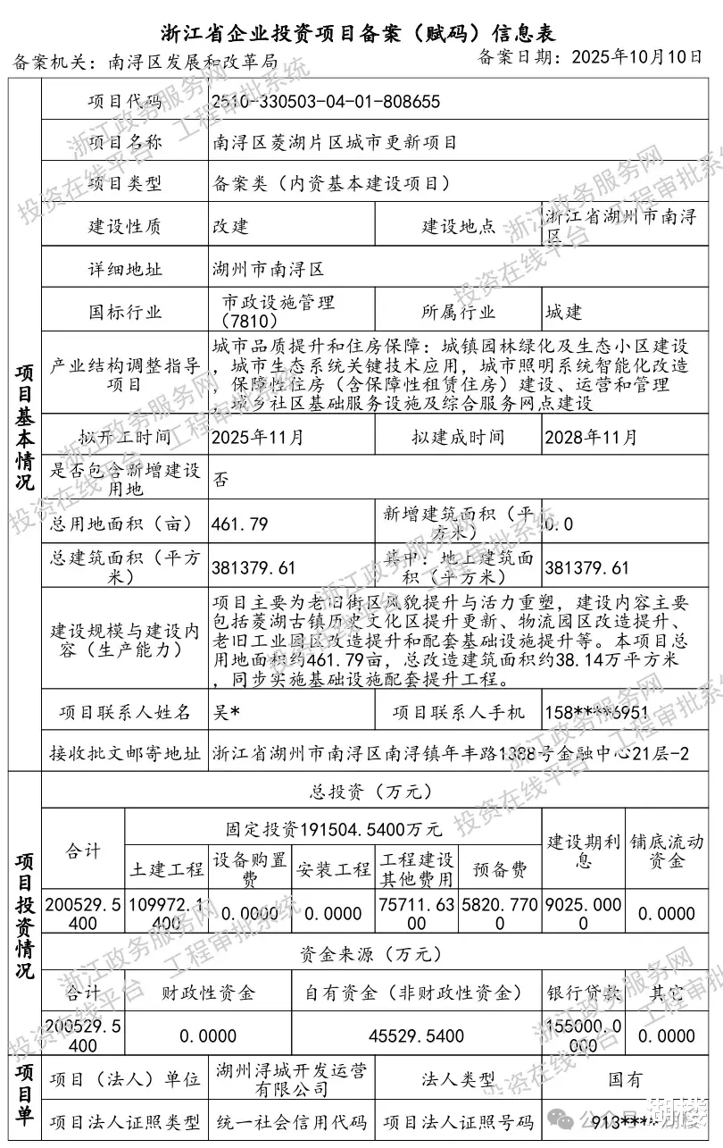 10月10日,湖州南浔区菱湖片区城市更新项目备案(赋码)信息表公布。