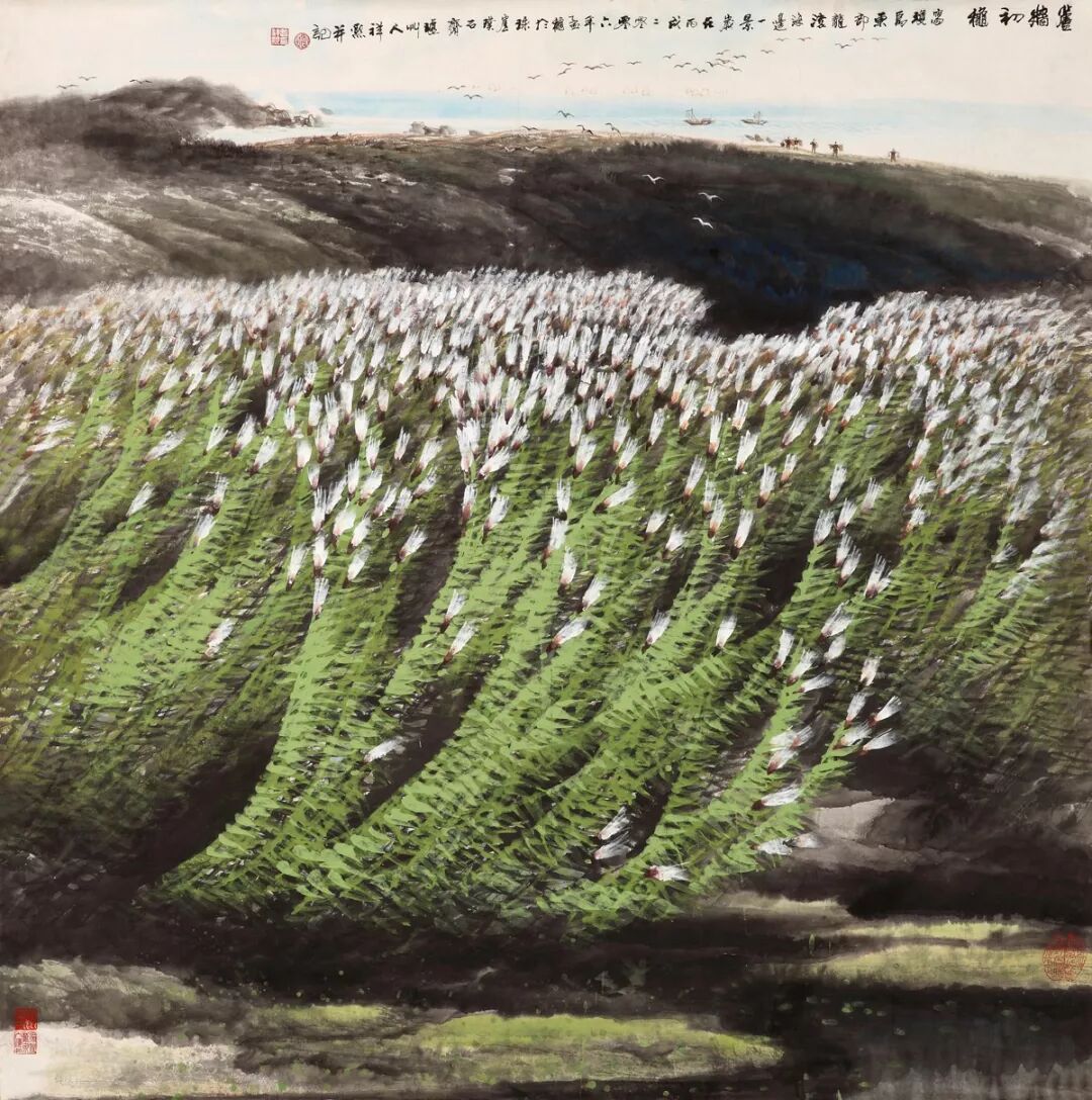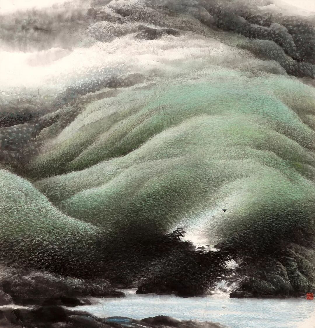 他的创作根植海南风物,以万泉河、椰林、雨林为灵感源泉,独创“鳞甲点”皴法表现热带山水的苍润生机,笔下椰林更升华为坚韧坦荡的精神符号。作品既含岭南画派的清新秀逸,又融西部生活的坚忍内敛,墨色交融间构建出清润含刚、静谧深邃的意境。作为海南省美协创始主席,他不仅以《风影》《椰颂》等作品屡获全国荣誉,更通过理论思考与实践探索,填补了海南山水画体系的空白。