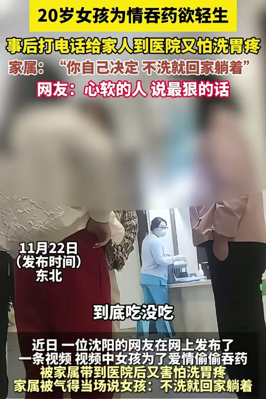 看到一则新闻让人心痛不已:一个年仅二十岁的女孩,因为情感问题竟然吞药欲轻生,之后又打电话给家人。当她来到医院,却因害怕洗胃的疼痛而犹豫不决。而家属的那句“你自己决定,不洗就回家躺着安安静静等死”,在网络上引发了激烈的讨论。