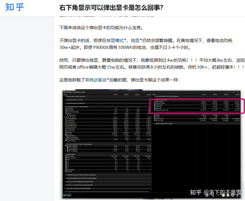 该网友反馈,其联想Y9000X游戏本在核显模式下,独显仍会频繁唤醒,导致整机功耗较高达30W起步,100Wh的电池也撑不过3~4个小时。然而,当弹出独立显卡后,核显接管的系统进入了低能耗模式,平均功耗仅为8W左右,浏览网页或者编辑文档也只有15W左右,电池续航更是达到了8小时,赶超轻薄本。