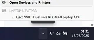 本月中旬,有网友表示在更新完系统(可能是2H25版本)后,竟然在任务栏右下角看到类似“弹出NVIDIA GeForce RTX XX显卡”的提示,这显然不符合常理。该网友调侃“前有新能源汽车弹出电池包,现有微软弹出显卡”。