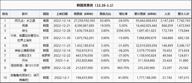 【数字飙榜,单周十佳】2022年第52周(12月26日~1月1日)韩国十佳票房:TOP1 詹姆斯·卡梅隆导演,萨姆·沃辛