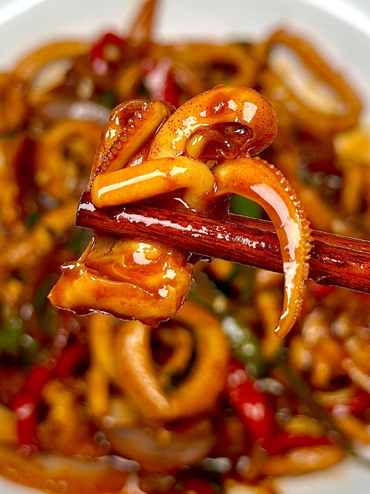 关火,装盘。看那盘中:鱿鱼卷曲成可爱的模样,周身裹着琥珀色的芡汁,配着色彩鲜艳的蔬菜,热气腾腾,锅气十足。夹起一块送入口中,外层是咸鲜微甜的酱香,咬下去是“咔嚓”一声的爽脆,接着是鱿鱼本身饱满的弹牙感和鲜甜的海味,层次丰富,好吃到停不下筷子。