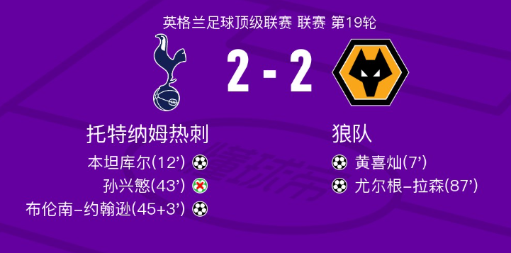 在北京时间今天凌晨结束的一场英超比赛中,热刺主场2-2战平狼队。这场比赛之所以两队战平,两名韩国国脚的发挥起了非常重要的作用。黄喜灿在开场7分钟就攻入世界波,而亚洲一哥孙兴慜在比赛进行到第43分钟,罚失了一粒点球。