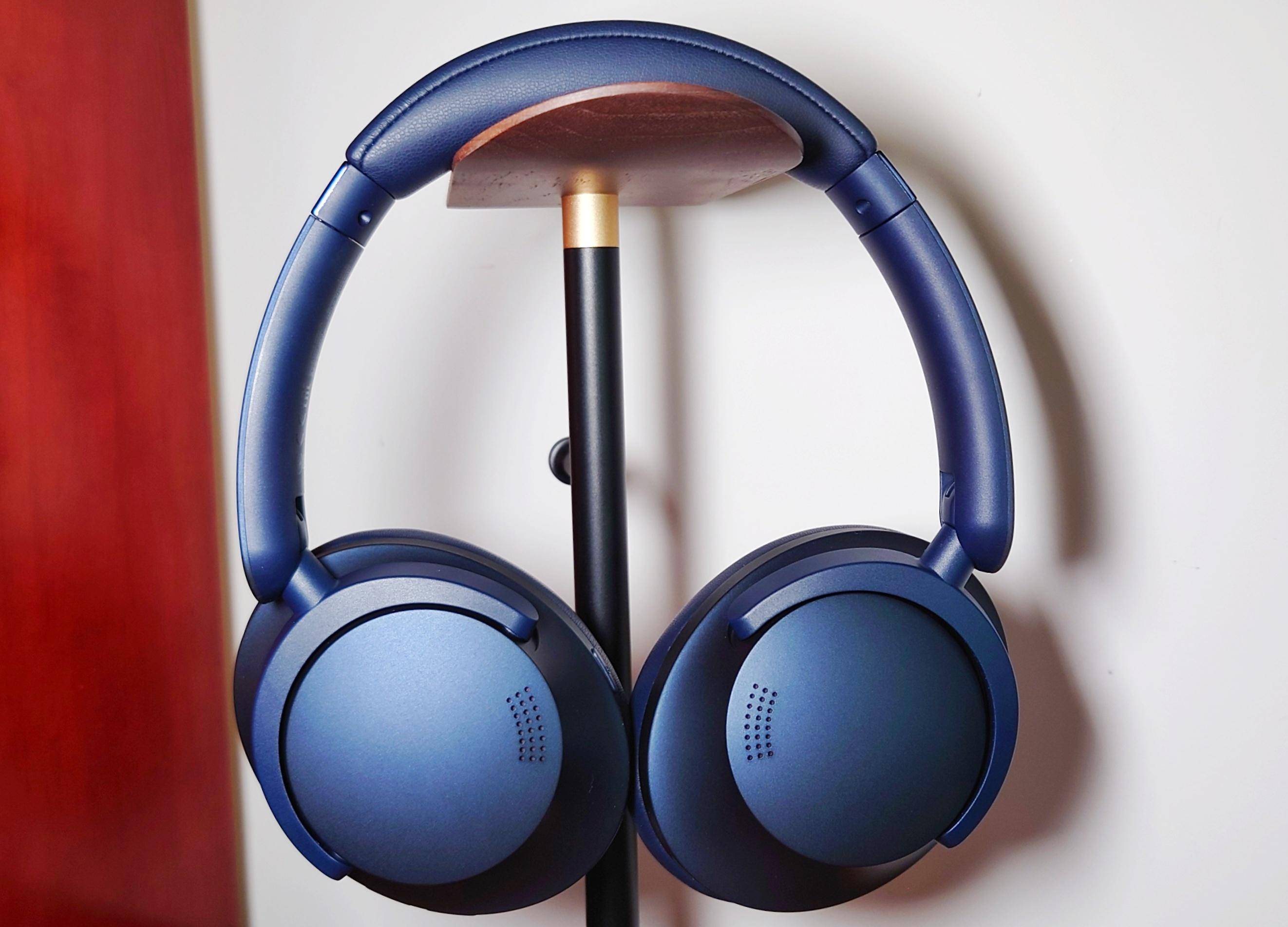 这款耳机延续了品牌一贯的稳重设计,深海蓝磨砂材质看着有一定潮流感。机身重量控制得不错,比较轻盈,还能折叠起来放进附赠的耳机袋里,日常携带挺方便。耳罩是慢回弹记忆海绵搭配皮革材质,头梁衬垫柔软度刚好,支撑力也适中,对不同头型的适配性尚可。长时间佩戴下来,不会有明显夹头感,也不会压迫眼镜,物理隔音有一定效果,同时能保持基本透气。
