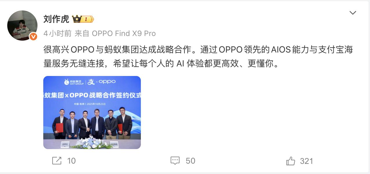 10 月 23 日,OPPO 与蚂蚁集团在杭州举办战略合作签约仪式,明确了双方未来的合作方向。