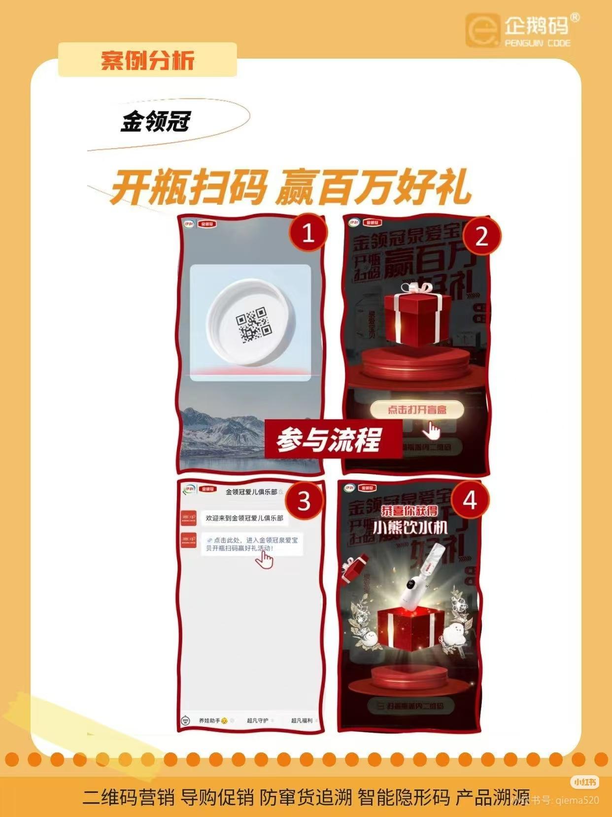 简单说,“一物一码” 就是给每一件产品一个专属的二维码 —— 金领冠泉爱宝贝直接把这个码印在瓶盖里。家长买完产品,打开瓶盖扫个码,就能触发抽奖,整个操作没门槛,就像平时扫红包一样简单。