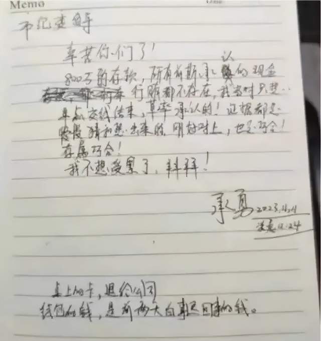 最后,承勇写下:“我不想受累了,拜拜”。这得是多么的绝望,能让一个两个孩子的父亲选择结束自己的生命。