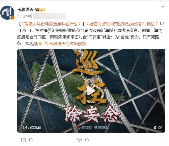 而在演习第二天,中国海警对外继续宣布:在12月30日,我海警编队继续位台岛周边邻近海域开展执法巡查,重点实施查证识别、警告驱离、临检拿捕等科目演练,检验了区域管控能力。这些都是要动用武力的硬科目。