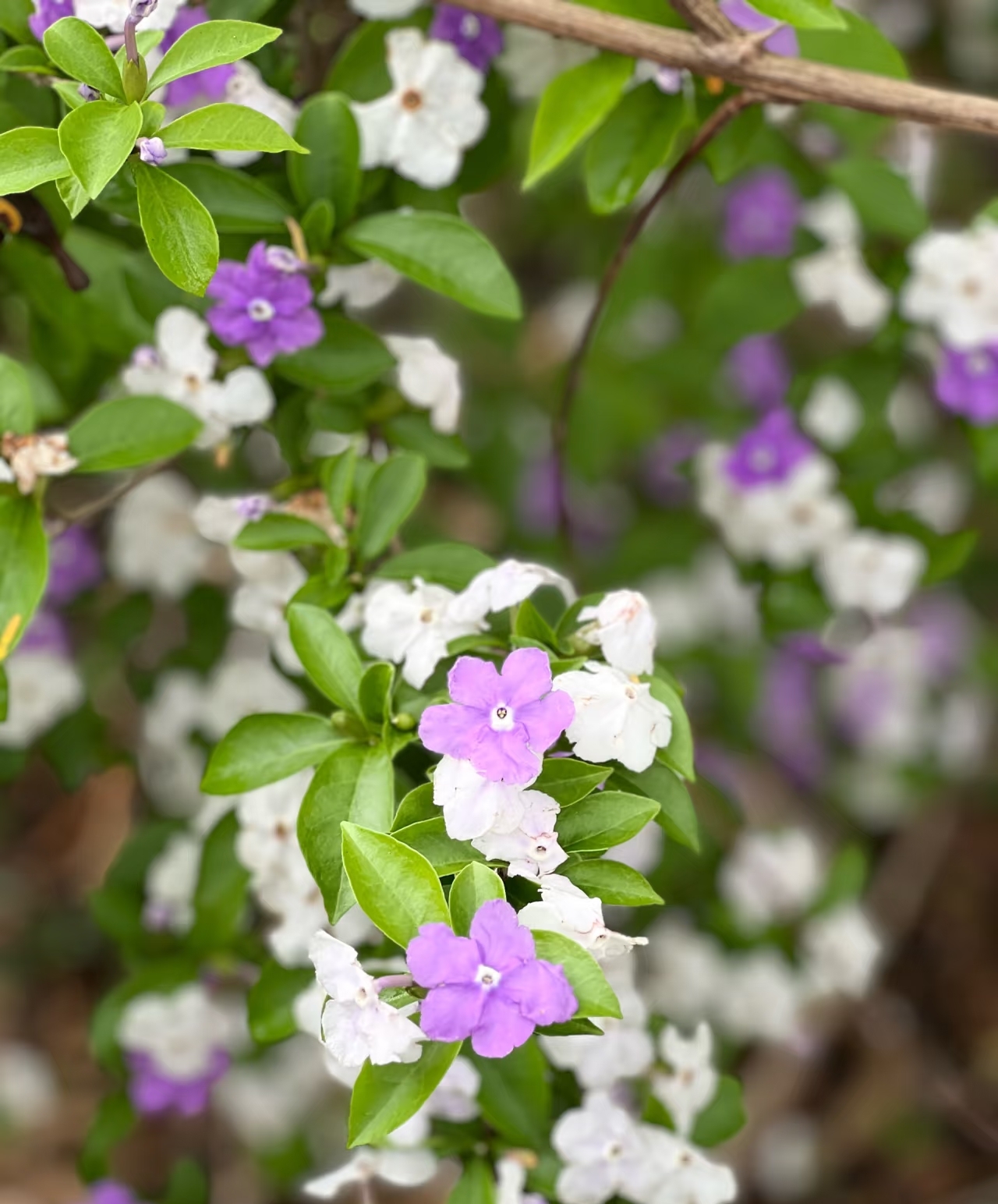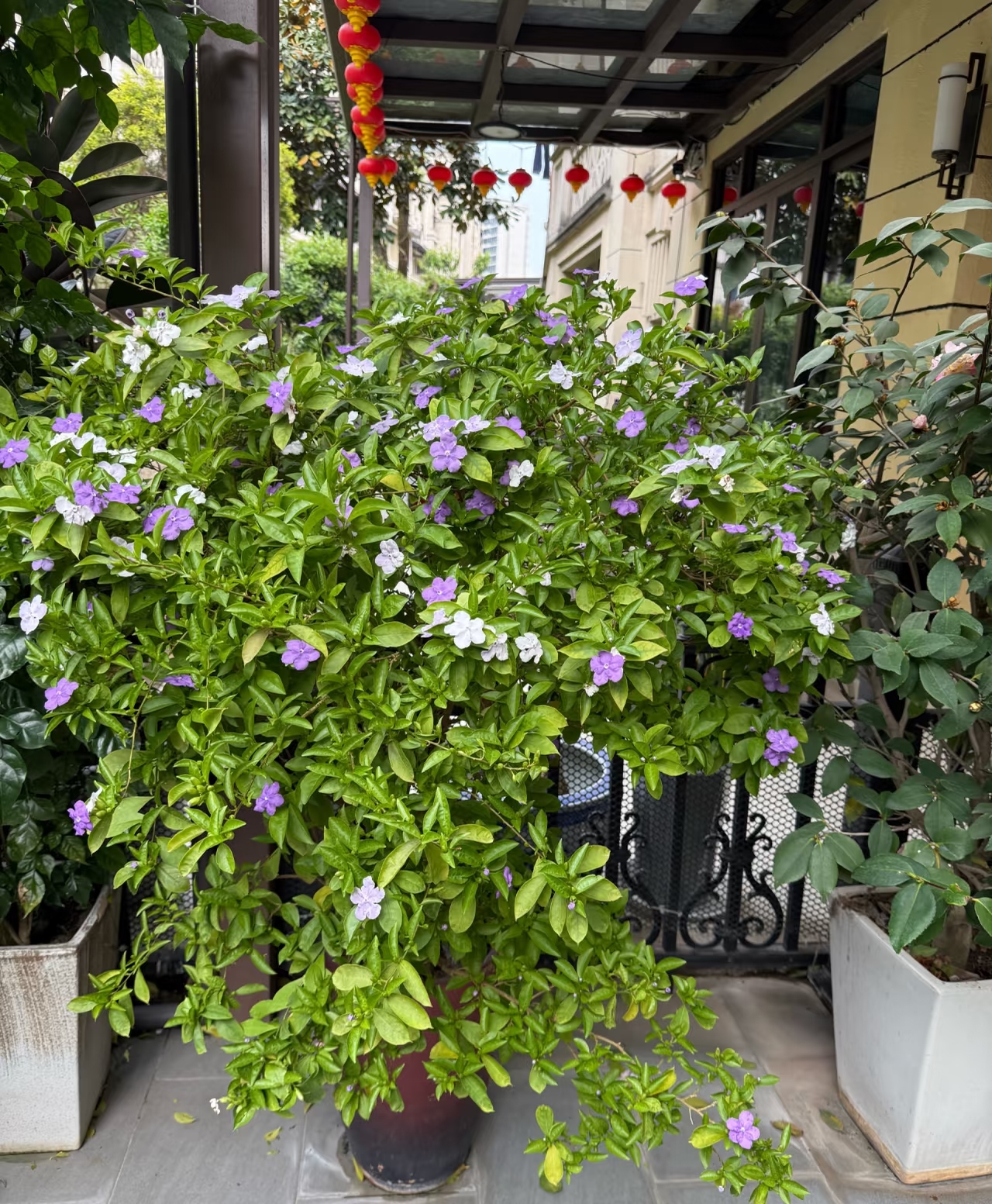 它是一种会变色的茉莉,刚开的时候是鲜艳的蓝紫色,然后慢慢变成紫色,最后变成白色。