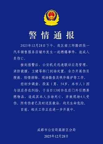 据成都市公安局高新区分局发布的警情通报显示:2025年12月28日下午,我区南三环路四段一汽车销售服务店铺外发生一起燃爆事件,造成人员伤亡。接到报警后,公安机关迅速联动应急管理、消防救援、卫健等部门到场处置,全力开展伤员搜救、险情排除、现场勘查及秩序维护等工作。