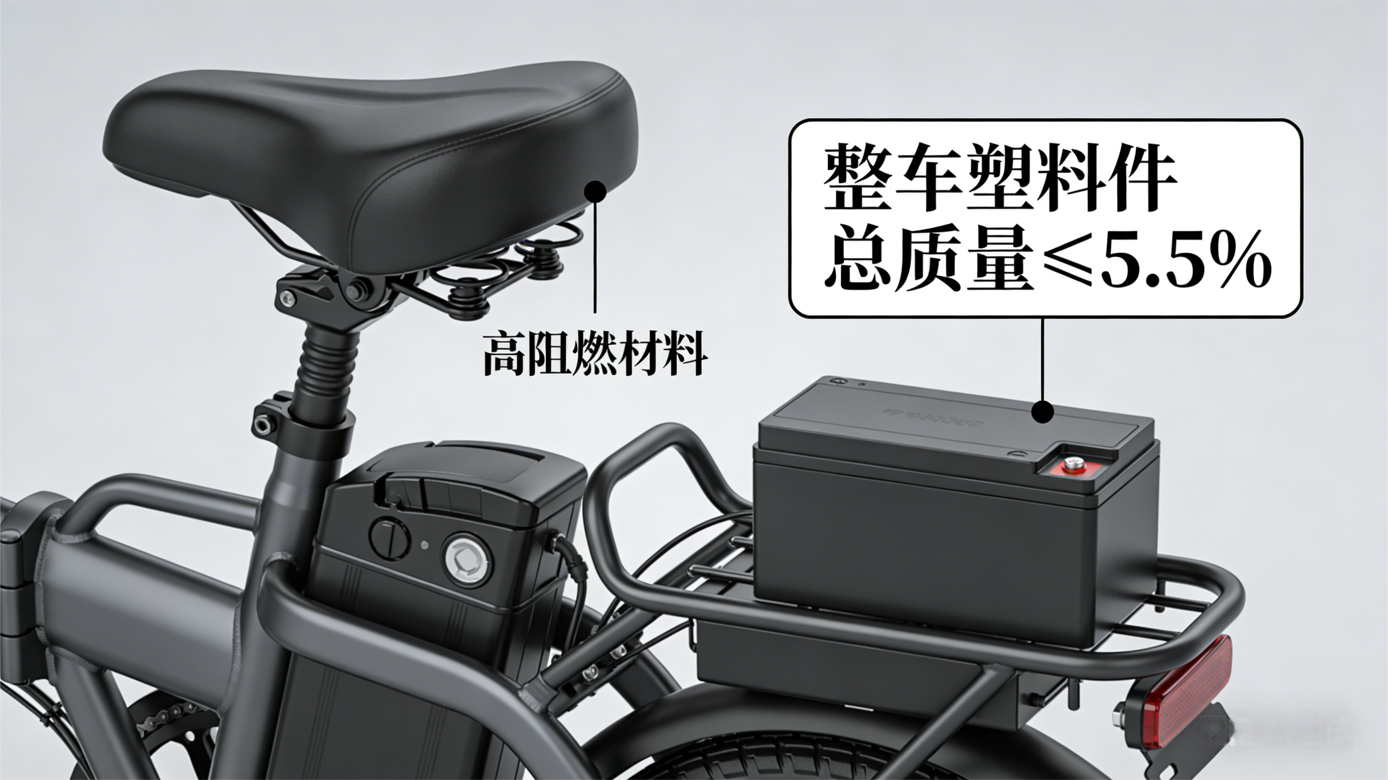 新标准的最大亮点之一,是史无前例地强化了车辆的防火性能。新规要求,整车塑料件的总质量不得超过整车质量的5.5%,并对鞍座、电池盒等关键部件的材料提出了高阻燃要求。