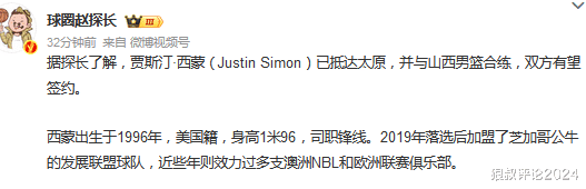 北京时间9月25日,根据媒体人赵探长的报道,贾斯汀·西蒙(Justin Simon)已抵达太原,并与山西男篮合练,双方有望签约。