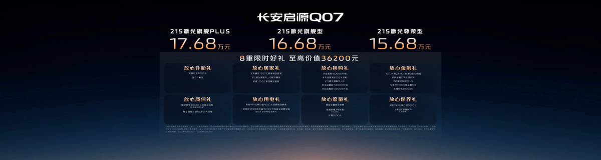 10月10日,全家人的智能SUV——长安启源Q07天枢智能激光版正式上新,共推出3款产品,分别为215激光尊荣型、 215激光旗舰型和215激光旗舰PLUS,上新价为15.68万元- 17.68万元。