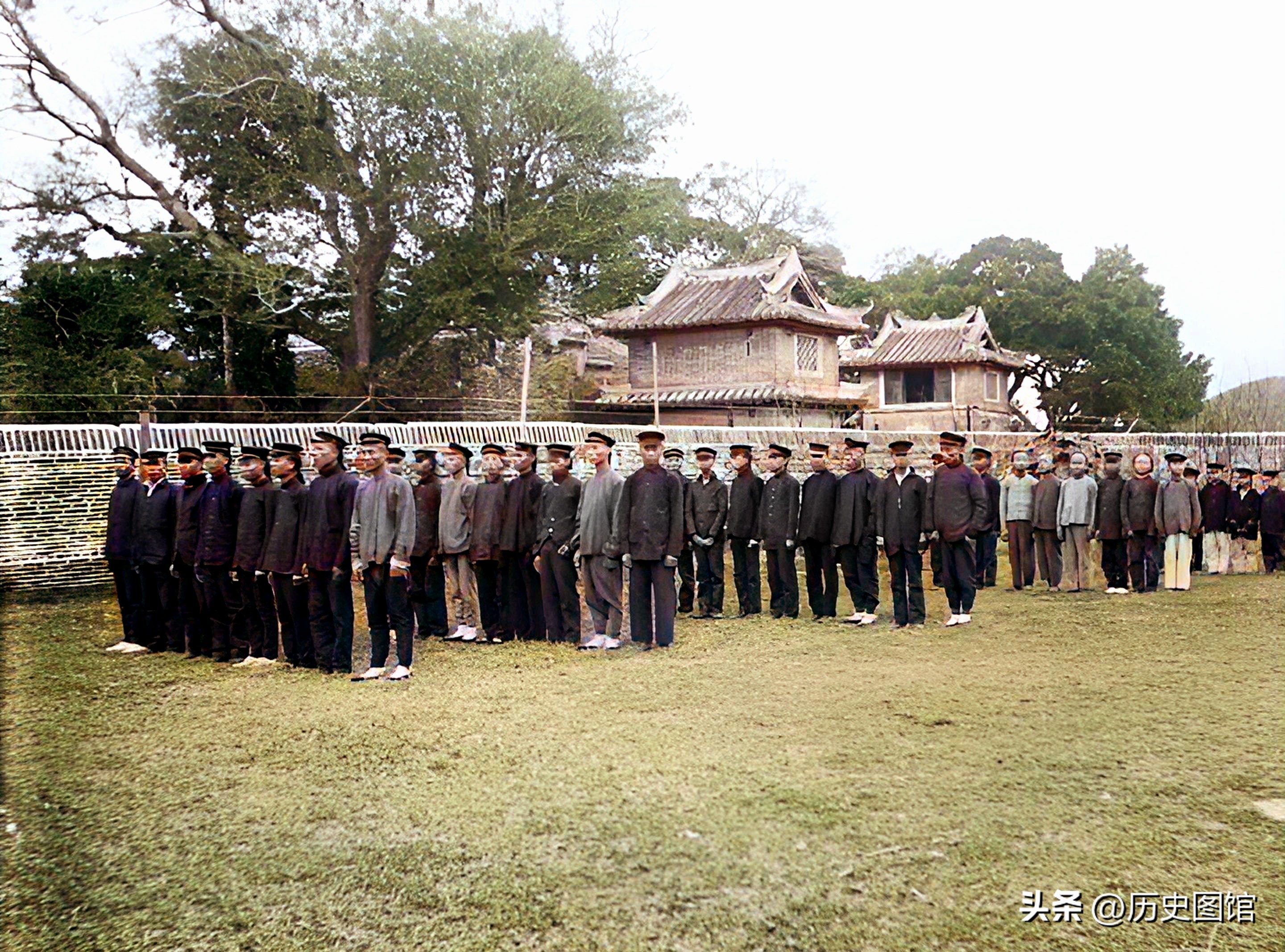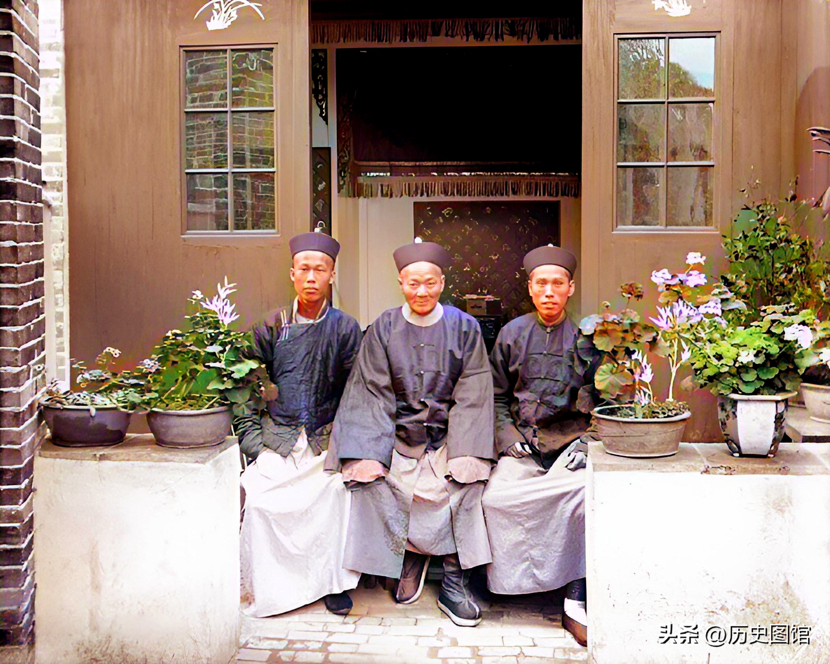 清朝末年,阳江县衙里,几名官员坐在门口合影。他们身穿官服,正襟危坐。环境布置的不错。门口的矮墙上放着一些观赏花卉。