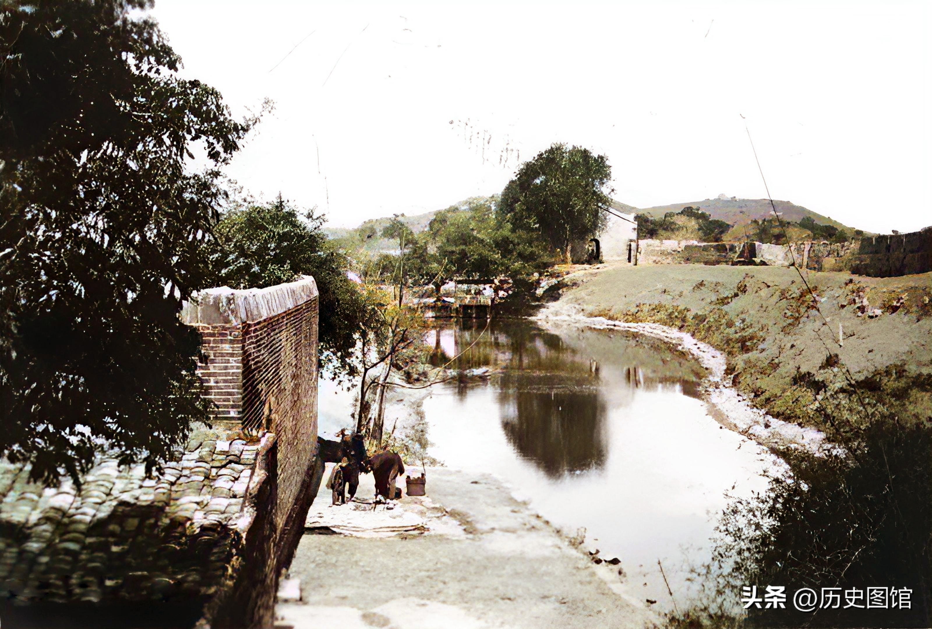 1922年,阳江城墙外面的一条小河,应该是过去的古护城河。河岸右侧能看到古老的城墙,河岸左侧近处,几个人正在水井上打水。风光静中有动,太美了!