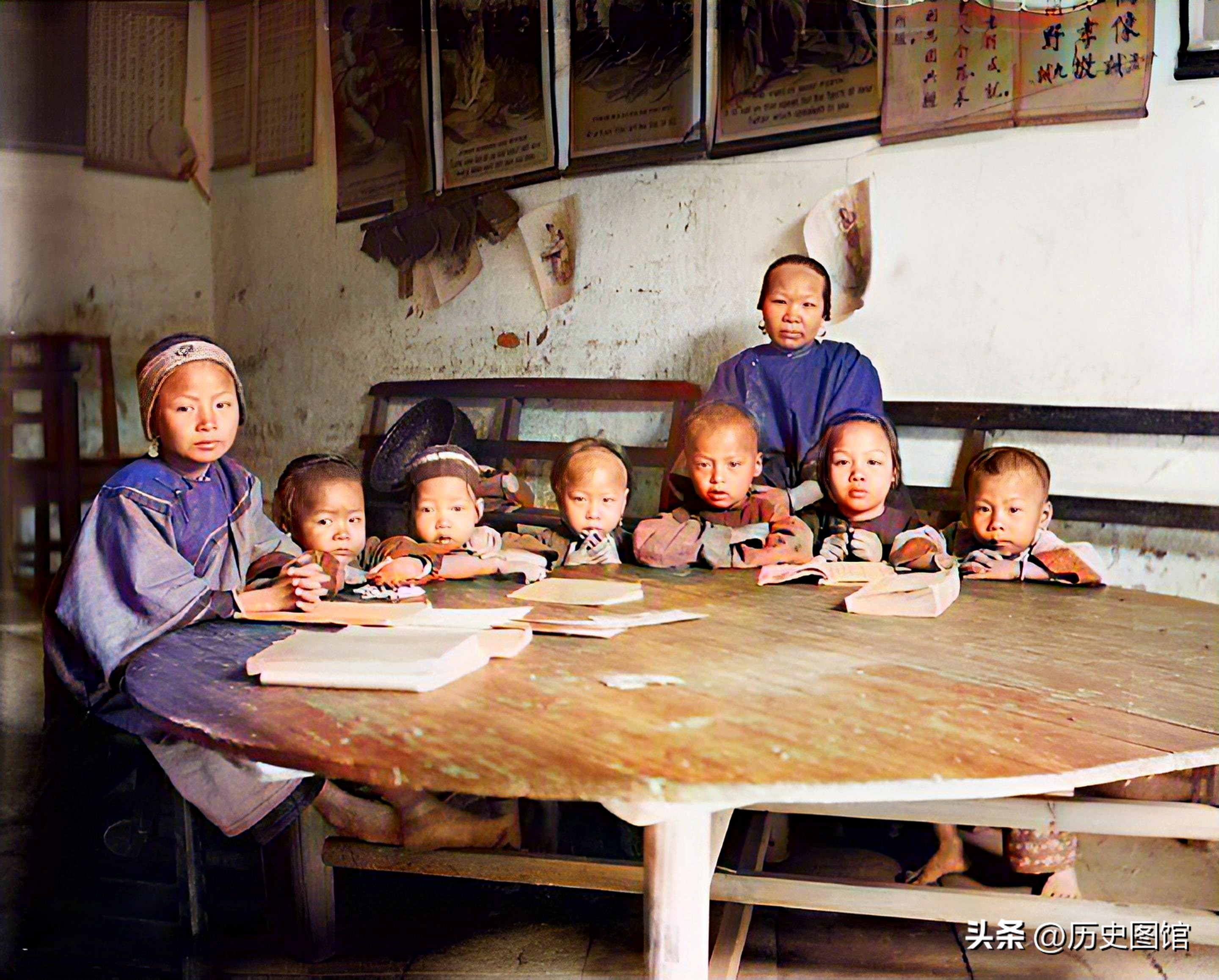 杜布森医生除了开办医院,为当地人排忧解难外,还开办了学校。照片中一些孩子正坐在大圆桌前学习,教室里墙壁上挂着很多字画。