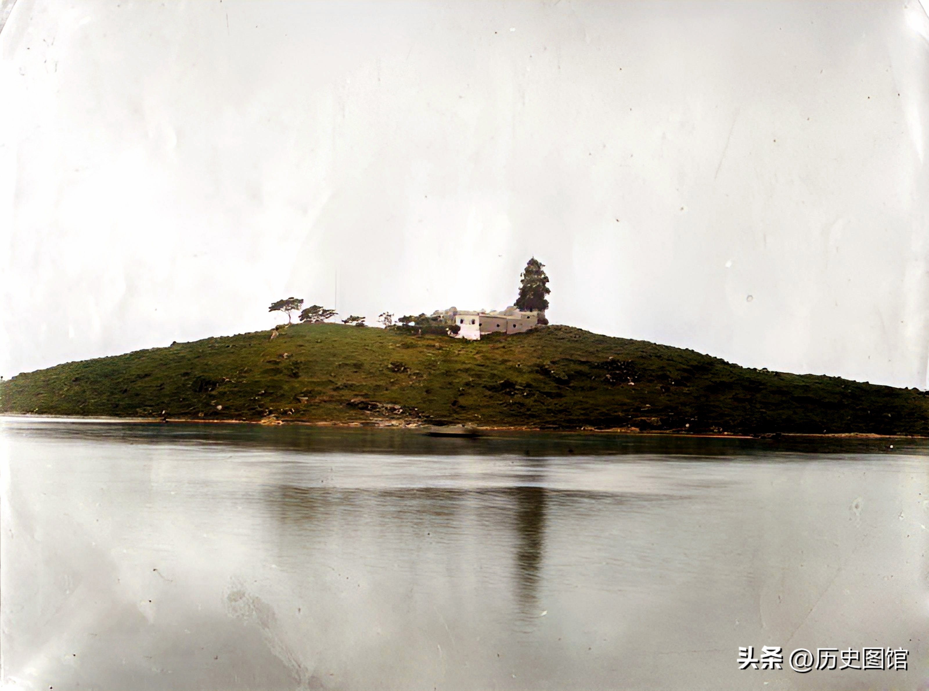 1923年,站在船上远眺,不远处山头上矗立着一座古塔,塔下应该是寺庙。古塔倒映在水中,太美了!据说,阳江有六座古塔,照片中这座塔,你能认出是哪座塔吗?