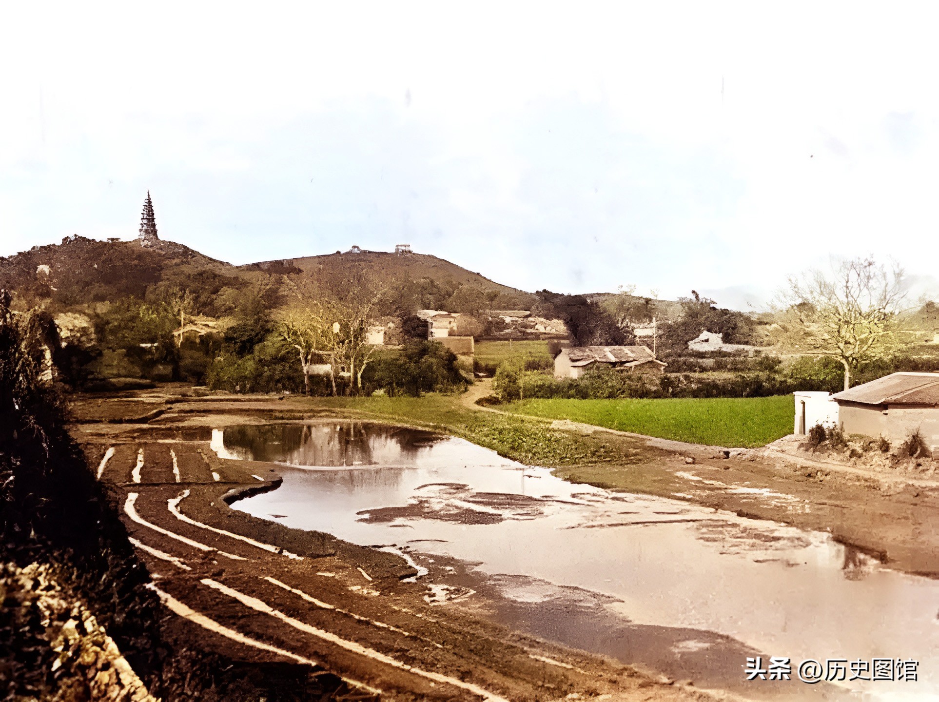 阳江东门承宣门外景象。一条小河旁,有大面积的农田,还有村庄。远处的山上矗立有宝塔,看外形像是北山石塔。风景太漂亮了!